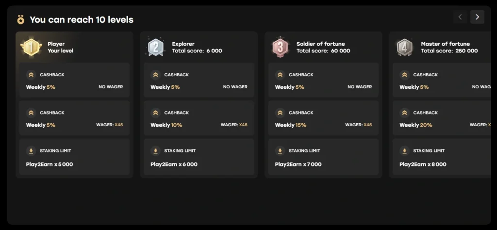 - Cashback: Recibí un porcentaje de tus pérdidas de vuelta. Este porcentaje aumenta con cada nivel, alcanzando un valor significativo para los jugadores más leales.